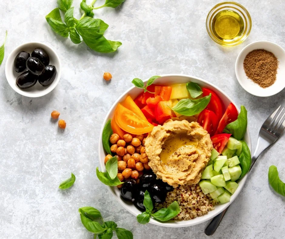 Mediterranean Quinoa Bowl – olives, cucumber, cherry tomatoes, and a sprinkle of feta.